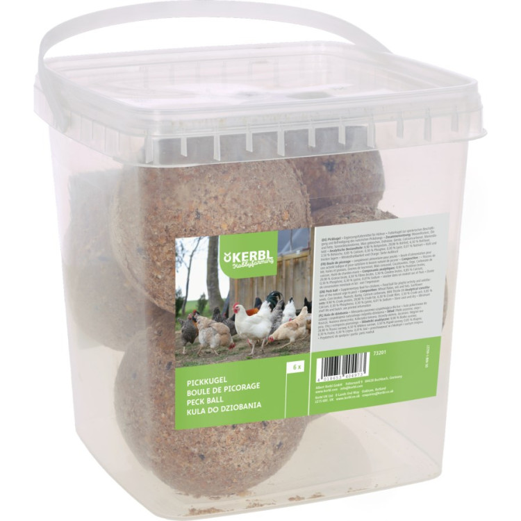 Kerbl Peck Ball este o bilă de furajare (de ciugulit) pentru găini, care le ține ocupate și le stimulează natural să ciugulească. Datorită formei rotunde și mișcării continue, rămâne interesantă pentru întregul efectiv pe termen lung, ceea ce poate ajuta la reducerea plictiselii, a stresului și a ciugulitului între păsări. În interior se află un amestec gustos cu floarea-soarelui, porumb și arahide, pentru completarea aportului de nutrienți vegetali importanți.