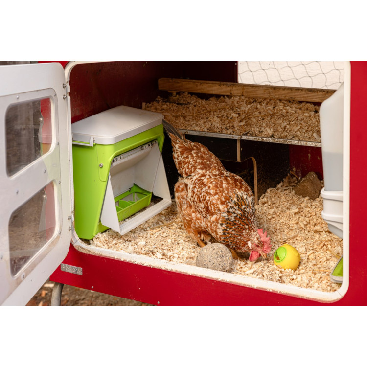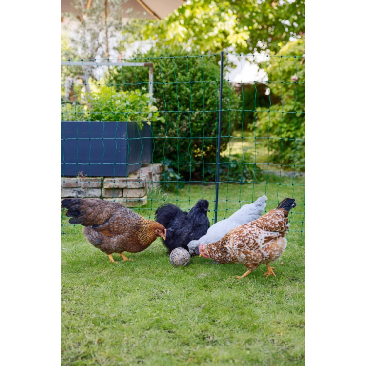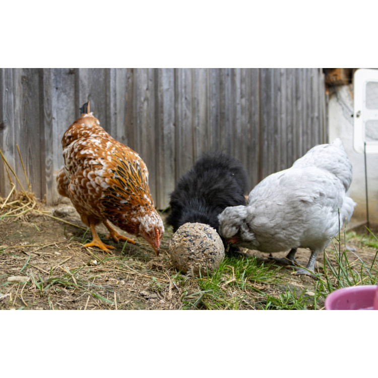 Obțineți o activitate practică pentru găini, care le atrage natural spre ciugulit. Funcționează datorită formei rotunde, care se mișcă și își schimbă poziția atunci când păsările o ating. În practică, este utilă mai ales când efectivul stă mai mult timp închis în cotețul pentru găini sau când în țarc „nu se întâmplă nimic”.