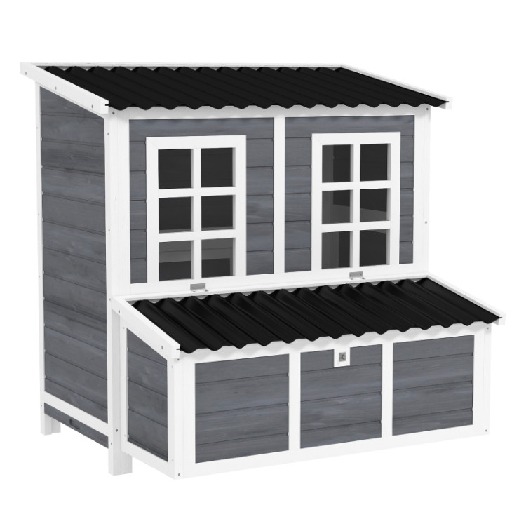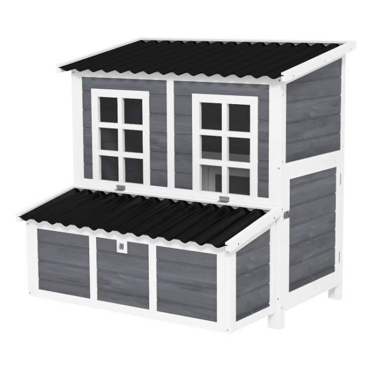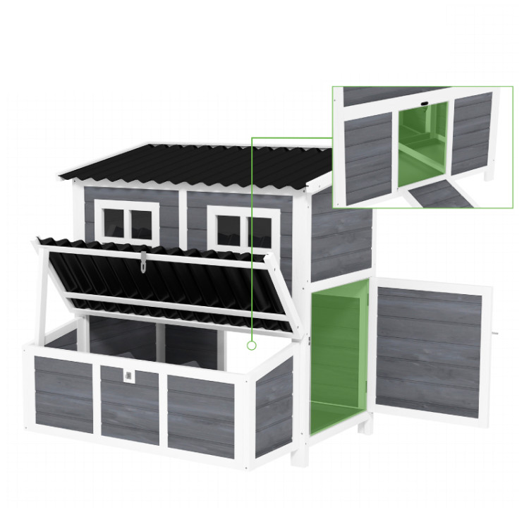 Datorită celor două uși de intrare și a unei rampe Găinile se pot mișca liber și în siguranță între coteț și zona exterioară . Stângile interioare oferă un loc confortabil pentru odihnă și somn, în timp ce ferestrele oferă multă lumină și vă permit să verificați stolul fără a fi deranjați inutil. Cotețul este fabricat din lemn masiv de brad de înaltă calitate și tratat cu un strat impermeabil , care îi prelungește durata de viață. Designul ridicat protejează structura de umezeala din sol și îmbunătățește circulația aerului. Acoperișul din plastic oferă apoi o protecție fiabilă împotriva ploii și a intemperiilor.