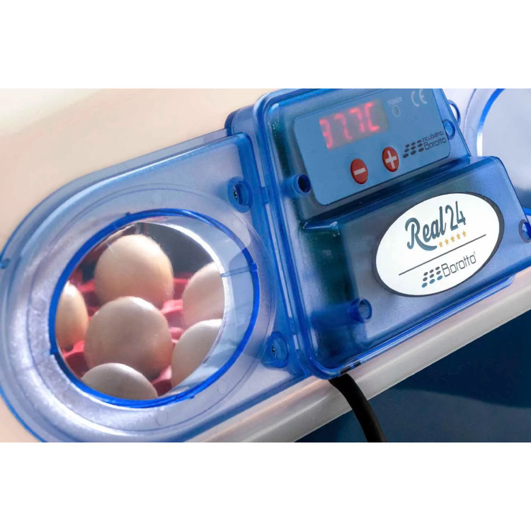 BOROTTO REAL 24 este un incubator universal pentru păsări de apă și păsări de sol, potrivit pentru găini, prepelițe, rațe, curcani, gâște și păsări exotice. Oferă întoarcere semiautomată a ouălor, control digital al temperaturii în intervalul 30-40 °C și reumplere manuală simplă a umidității prin deschideri exterioare, fără a fi nevoie să deschideți incubatorul. Incubatorul este dezvoltat și fabricat de compania italiană BOROTTO, specializată în tehnologia de incubare, iar produsele sale nu sunt producție chineză anonimă, ci un produs european original.